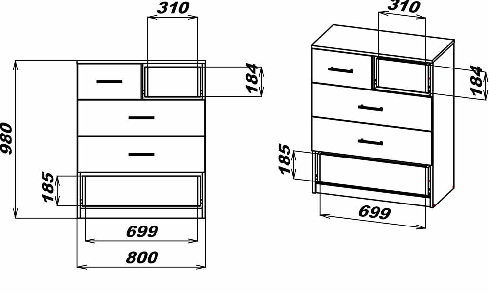 Цей комод з п'ятьма шухлядами стане хорошиим рішенням для Вашої спальні або вітальні. Верхня секція комоду розілена на дві окремі шухляди щоб розділити дрібніші речі між собою. Він має елегантний дизайн з простими формами та зручними ручками, дизайн яких ви можете підбирати під ваші побажання. П'ять шухляд різних розмірів дозволяють зручно організувати зберігання речей. Комод виготовлений з міцного ЛДСП 18 мм. Обирайте колір та додавайте фурнітуру з дотягом, змініть розміри та кількість шухляд - створіть комод, який ідеально відповідатиме вашим потребам.