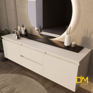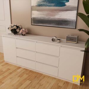 Дана тумба під телевізор з мінімалістичним дизайном. Вона має дві секції з дверцятами по боках за якими сховані полички та відкриту полицю посередині. Тумба виглядає сучасною та функціональною, добре підійде для вітальні або спальні та може бути використана як столик для журналів.