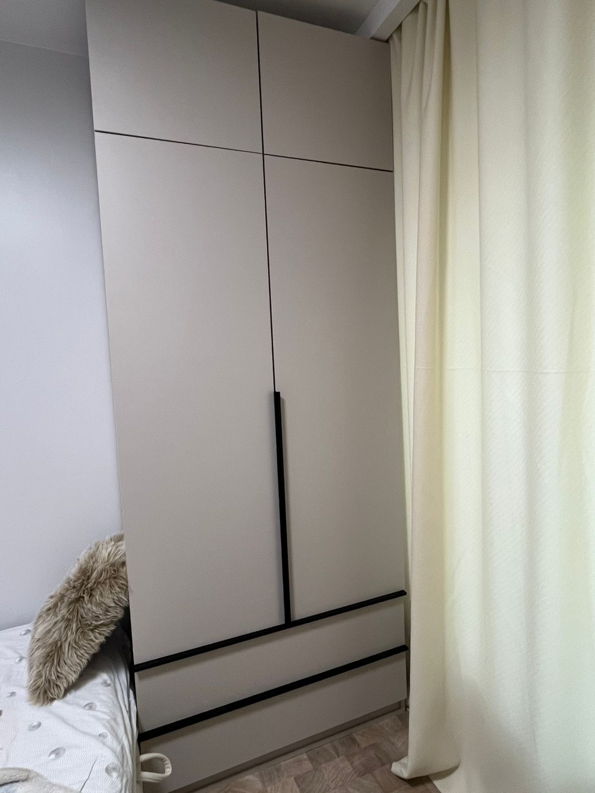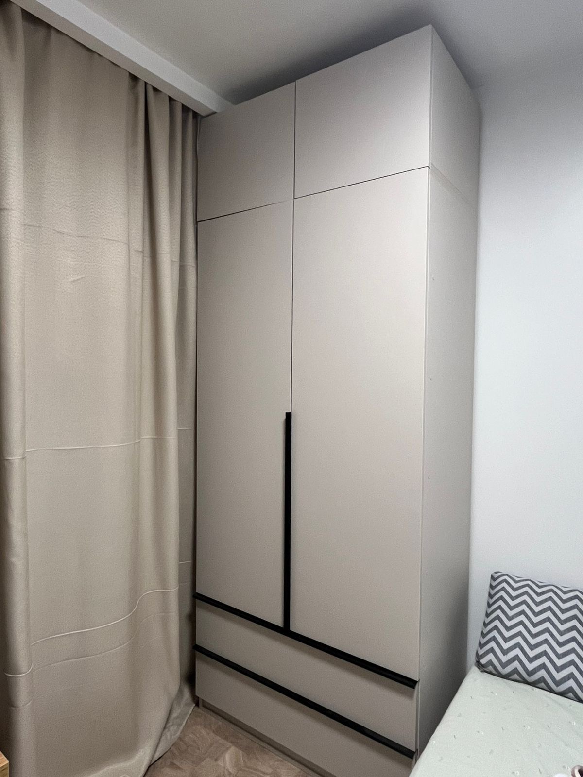 Шафа з місткими полицями, штангою для одягу, а також двома шухлядами дозволить зберігати вам найрізноманітніші речі. Ручки профілі будуть стильним доповненням до її конструкції. Змінюйте розміри та наповнення, щоб зробити її ще зручнішою для Вас