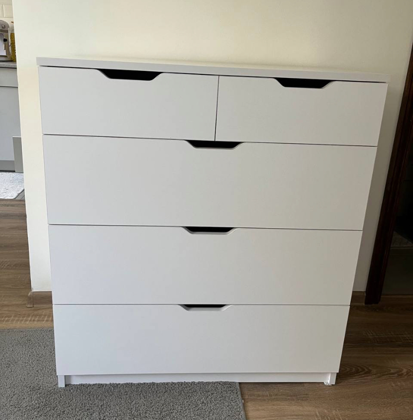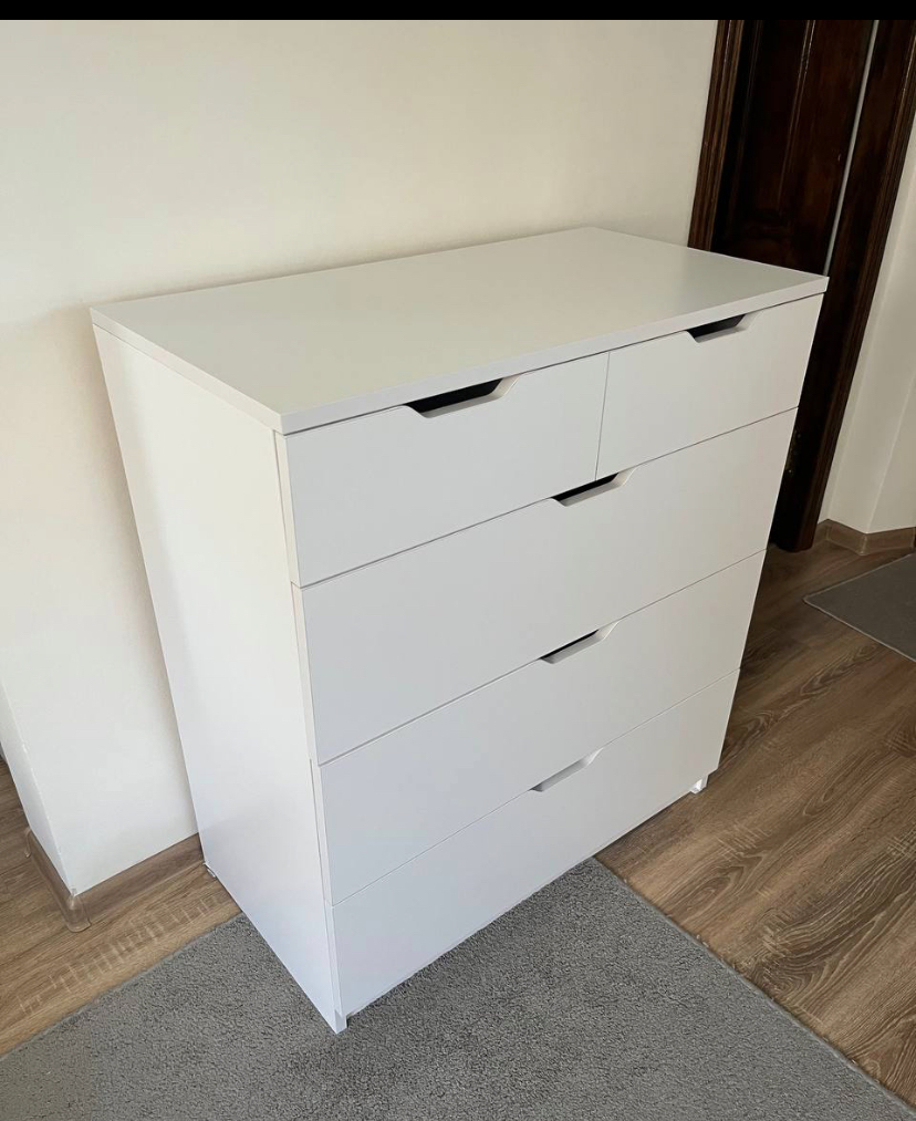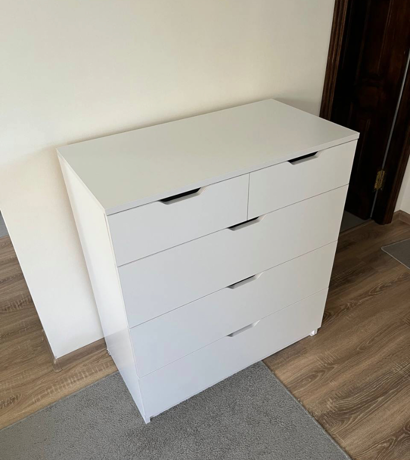 Цей комод з п'ятьма шухлядами стане хорошиим рішенням для Вашої спальні або вітальні. Верхня секція комоду розілена на дві окремі шухляди щоб розділити дрібніші речі між собою. Він має елегантний дизайн з простими формами та зручними ручками, дизайн яких ви можете підбирати під ваші побажання. П'ять шухляд різних розмірів дозволяють зручно організувати зберігання речей. Комод виготовлений з міцного ЛДСП 18 мм. Обирайте колір та додавайте фурнітуру з дотягом, змініть розміри та кількість шухляд - створіть комод, який ідеально відповідатиме вашим потребам.