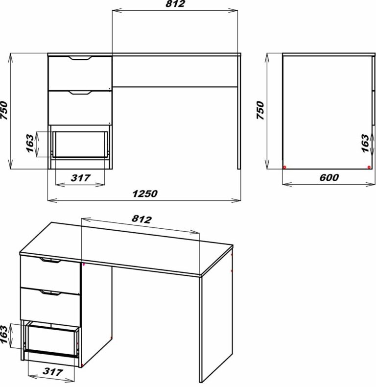 Красивий письмовий стіл з шухлядами, ручки яких виконані у формі вирізів. Шухляди можуть бути розміщені на праву та на ліву сторону, щоб дозволити максимально ефективно використовувати стіл в залежності від ваших завдань. Кількість шухляд та фурнітура можуть бути змінені, як і ширина, глибина та висота столу.
