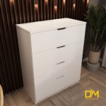 Комод замість ручок оснащений зручними вирізами, що забезпечують легке та комфортне відкривання шухляд. А завдяки телескопічним направляючим, ви зможете максимально ефективно використовувати весь їх простір, легко дістаючи речі навіть з самого глибокого куточка.