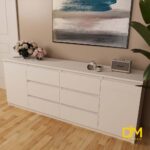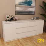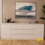 Комод оснащений шістьма шухлядами, зручно розташованими посередині в три ряди, та двома відділеннями з полицями за дверцятами по боках. Таке поєднання дозволяє зберігати різноманітні речі: від одягу до документів та аксесуарів. Відсутність ручок надає комоду доволі суворого вигляду та підкреслює його мінімалістичний дизайн. Цей комод стане незамінним елементом у вашому домі, допомагаючи підтримувати порядок та створювати затишну атмосферу через значний об’єм речей, що в нього може поміститись.