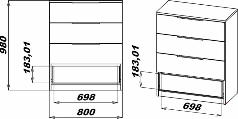 Виготовлений з якісного ЛДСП 18 мм, комод доступний у різноманітних кольорах. Розміри (Ш/В/Г): 980/800/400 мм. Обирайте ручки-профілі чорного або білого кольору та створіть свій унікальний дизайн. За бажанням можна змінити розміри та наповнення комоду, а також обрати фурнітуру з дотягом.