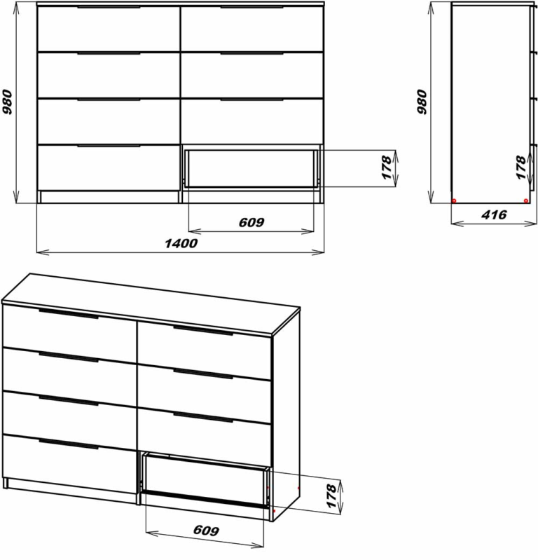 Зверніть увагу на нашу модель з 8 шухлядами в поєднанні із зручними ручками-профілями. Глибокі шухляди з телескопічними направляючими повного висуву забезпечують легкий доступ до речей і тепер ніщо не заховається в «глибині шухляди». Для ще більшої надійності можна замовити потовщену стільницю, а зробити його ще більш зручним зможуть направляючі з дотягом, які ви також можете замовити додатково. Обирайте дизайн ручок на свій смак чорного або білого кольорів. Матеріал, з якого виготовлений комод, легкий у догляді та очищенні, що зробить його використання максимально комфортним. Також ми можемо змінити глибину та кількість шухляд під ваші потреби.