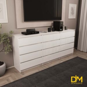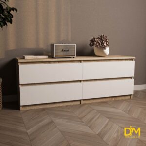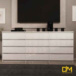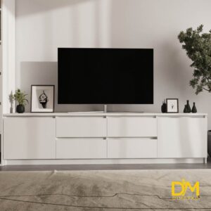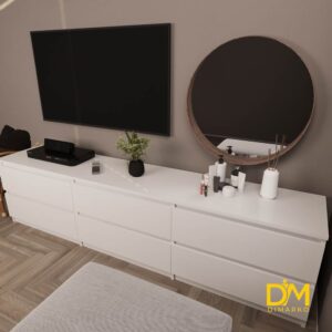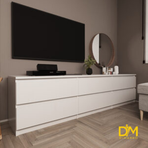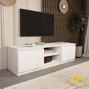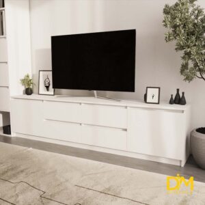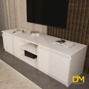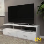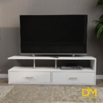 Тумба під телевізор з відритою секцією під стільницею дозволить розміщувати приймачі не заставляючи поверхні, а дві шухляди дозволять зручно зберігати ігрові приставки або інші речі, так необхідні для зручного перегляду фільмів.