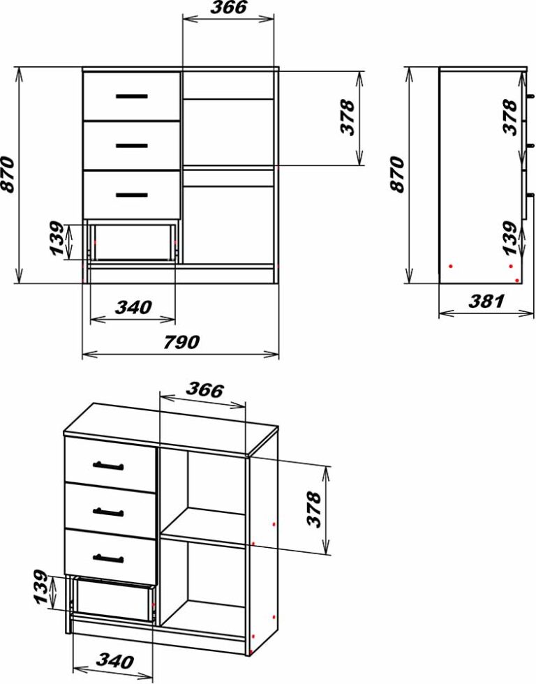 Комод з чотирма шухлядами та дверцятами за якими є дві просторні секції розділені поличкою. Дизайн ручок ви можете обирати та змінювати за власним побажанням. Двері в комоді можуть бути виготовлені на праву або ліву сторону.